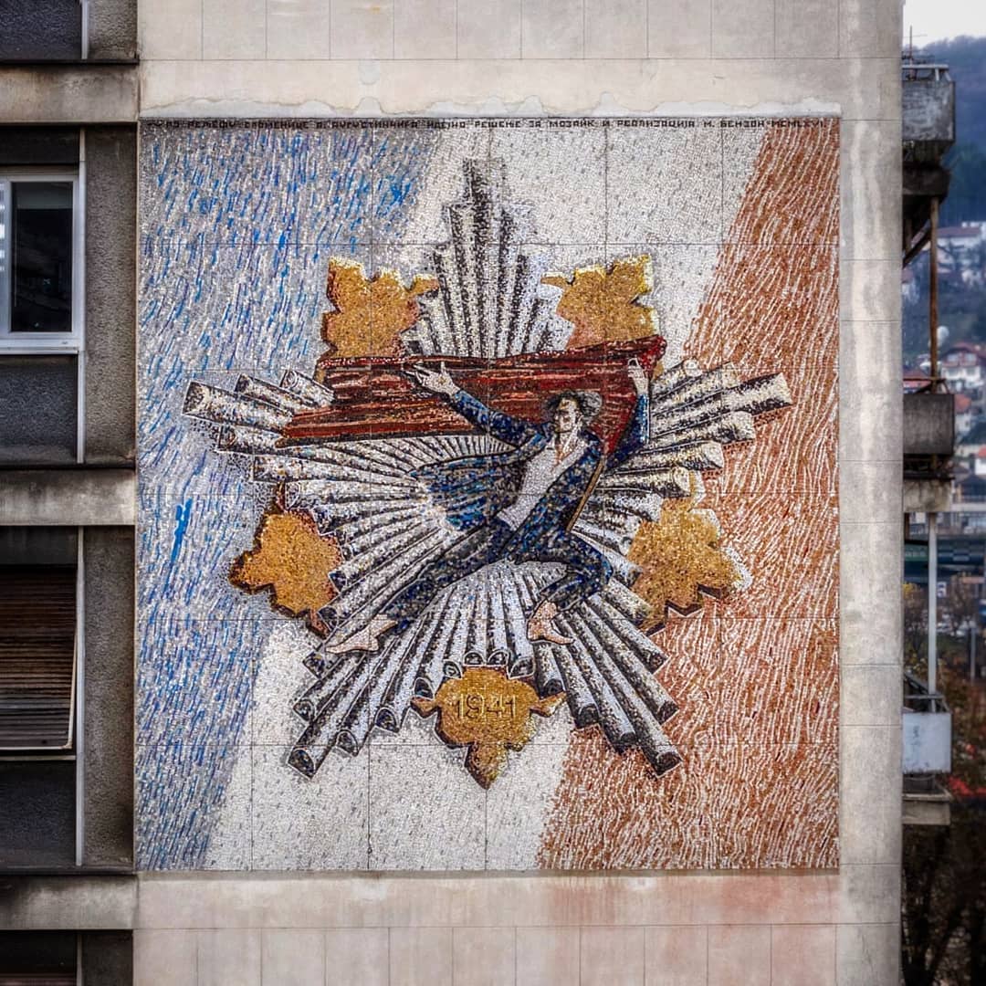 Мозаик смештеног на зиду стамбене зграде у самом центру града Ужица, Србија на северозападном углу Партизанског / Градског трга. Овај мозаик приказује мотив који је познат под називом „Партизански споменик 1941.“, а приказује партизанског борца који држи југословенску заставу док гестикулира према својим колегама борцима да јуриша напред. Овај мотив је коришћен за медаљу (Споменица) која се додељује партизанским борцима који су се придружили покрету отпора 1941. године и преживели до краја Другог светског рата. Преко 27.000 таквих медаља доделила је југословенска влада. Овај спомен мозаик настао је на 20. годишњицу устанка.