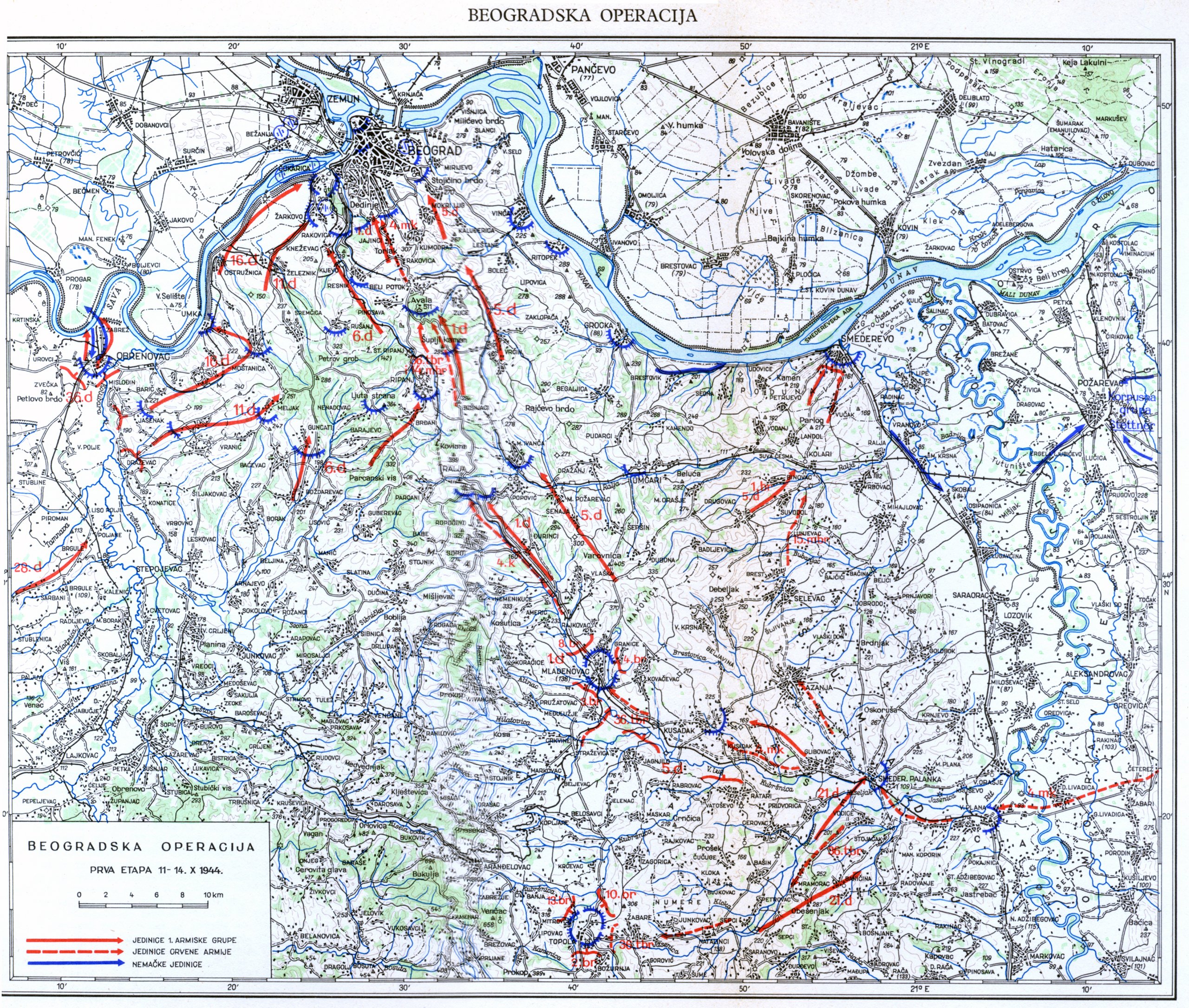 Претходним наређењима, јединице и. армијске групе добиле су оријентирне правце за наступање: и. пролетерски корпус у захвату комуникације Топола—Младеновац—Раља, а 12. ударни корпус према Обреновцу и Жаркову. Већ 9. октобра по две бригаде 11. крајишке и 16. војвођанске дивизије 12. ударног корпуса почеле су борбе за Обреновац, али су 11. октобра упућене према Београду; за блокаду Обреновца остављена је 36. војвођанска дивизија и једна бригада 2. крајишке дивизије. Врховни командант је тога дана обавестио Штаб 1. армијске групе да ће делови Црвене армије за дан-два избити из источне Србије на Велику Мораву, одакле ће преко Смедеревске Паланке и Младеновца наступати према Београду. Команданту 1. армијске групе наређено је да се његове јединице најкасније 11. октобра, а ако је могућно још истог дана, сретну са јединицама Црвене армије код Смедеревске Паланке, Велике Плане, Доње Раче и код Брзана. У наређењу је речено да ће тамо јединице добити камионе за брже наступање према Београду. У духу те директиве, 1. пролетерска дивизија упућена је у напад на Младеновац, 17. источнобосанска дивизија у напад на Тополу, 21. српска дивизија у сусрет Црвеној армији, с тим да заузме Велику Плану, а 5. крајишка дивизија Смедеревску Паланку. Предњи делови 68. стрељачког корпуса Црвене армије заузели су тога дана Велику Плану и Смедеревску Паланку, где су се ујутру 11. октобра први пут среле јединице 1. армијске групе и Црвене армије.