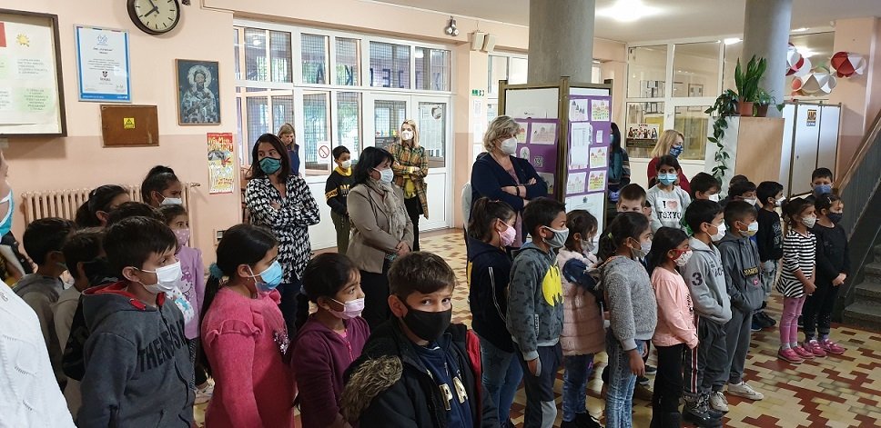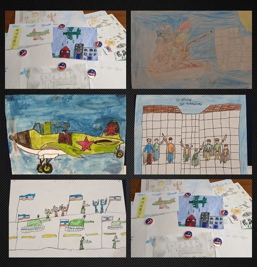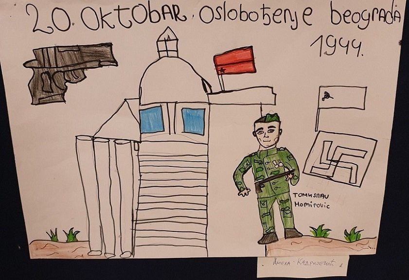 Ученици су били јако вредни и инспиративни. Ликовна секција ове школе је прикупила 45 радова. Тема је била ослобођење Београда виђено очима ових малишана. На главном паноу је постовљено шест најбољих радова по мишљењу стручњака а сви остали радови ће се наћи у специјалној брошури која ће бити штампана после октобарских празника. Ученици су нас одушевили и изненадили колико су били маштовити и како су они видели борбе за ослобођење Београда. Са одушевљењем смо гледали шарене авионе, палату „Албанија“ са истакнутом заставом, војнике са партизанским обележјима али и борце Црвене армије. Изложбу су у присуству ученика и наставника отворили, директорка ОШ „Сутјеска“, госпођа Јасмина Стојчић и пуковник Бора Ерцеговац, заменик председника СУБНОР Србије и председник Градског одбора СУБНОР Београда. Пуковник Ерцеговац је говорио о борбама за ослобођење Београда и коначној победи и ослобођењу Београда од стране партизана и братске Црвене Армије.