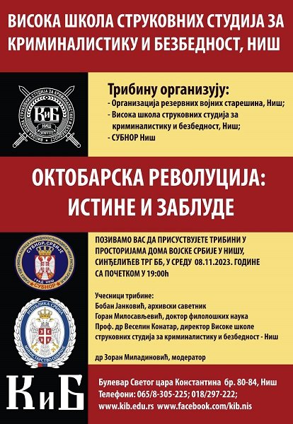 СУБНОР града Ниша, Организација официра и подофицира из Ниша и Висока школа струковних студија за криминалистику и безбедност организовали су трибину на тему „Истине и заблуде октобарске револуције“ која је одржана 8. новембра у свечаној сали Дома војске у Нишу. Догађај су својим присуством увеличали председник СУБНОР-а града Ниша пуковник у пензији Анђелко Милићевић, председник градске Организације резервних официра и подофицира пуковник у пензији Добривоје Станимировић, директор Високе школе струковних студија за криминалистику и безбедност др Веселин Конатар, припадници Војске Србије, челни људи Руско-српског хуманитарног центра, представници борачких и патриотских организација, заинтересовани грађани, студенти, средњошколци и други гости. На трибини су говорили врстан познавалац историје Русије др Веселин Конатар, историчар и филолог др Горан Милосављевић и архивски саветник Бобан Јанковић, а улогу модератора обављао је др Зоран Миладиновић.