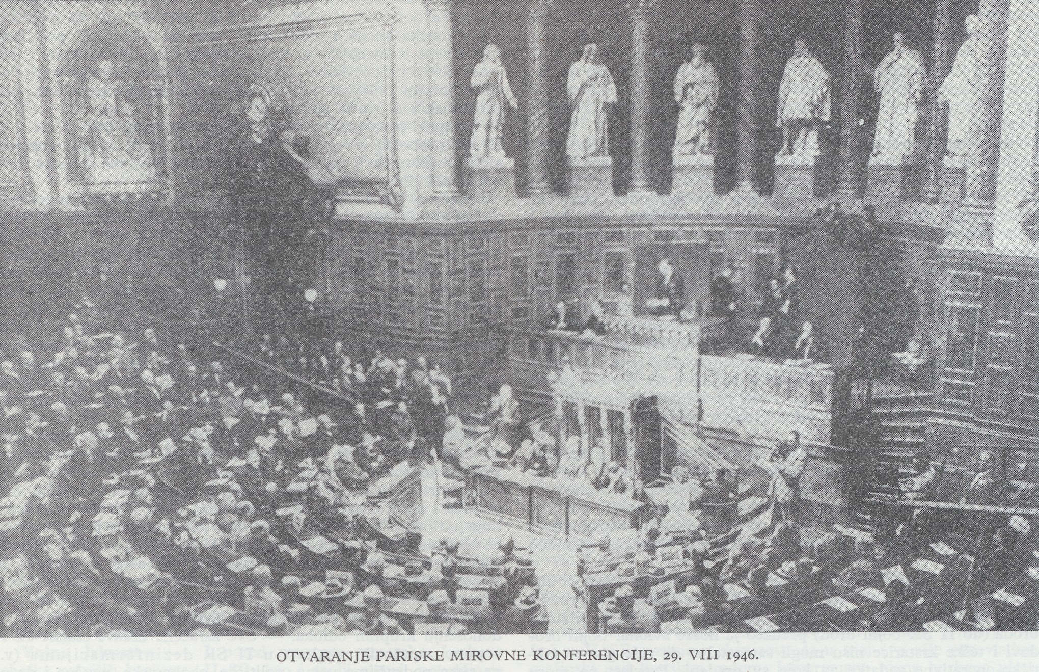 Мировни уговори. Послератни свет. — На Потсдамској конференцији, јул—август 1945, решено је да се оснује Савет министара иностраних послова САД, СССР, Француске, Кине и В. Британије који ће имати дужност да припреми пројекте уговора о миру са победеним државама. На Московској кон­ференцији, децембра 1945, министри иностраних послова СССР, САД и В. Британије постигли су сагласност о процедуралним пита­њима припреме мировних уговора. Савет министара иностраних послова заседао је 1945. у Лондону и Москви, и 1946. у Паризу, и припремио нацрте мировних уговора. Они су послужили као основа за дискусију на Паришкој мировној конференцији, одржа­ној у периоду јул—октобар 1946. између представника држава антифашистичке коалиције (21 држава) и бивших савезника нацистичке Немачке у Европи (Бугарске, Финске, Италије, Мађарске и Румуније). Паришка мировна конференција требало је да припреми ми­ровне уговоре. Већ је на њој дошло до озбиљних размимоилажења бивших савезника, до настојања поделе света на два блока. Кона­чно, 10. 2. 1947. потписани су паришки мировни уговори између савезничких сила антифашистичке коалиције и бивших савезника фашистичке Немачке у Европи (Бугарске, Финске, Италије, Мађарске и Румуније). Ступили су на снагу 15. 9. 1947.