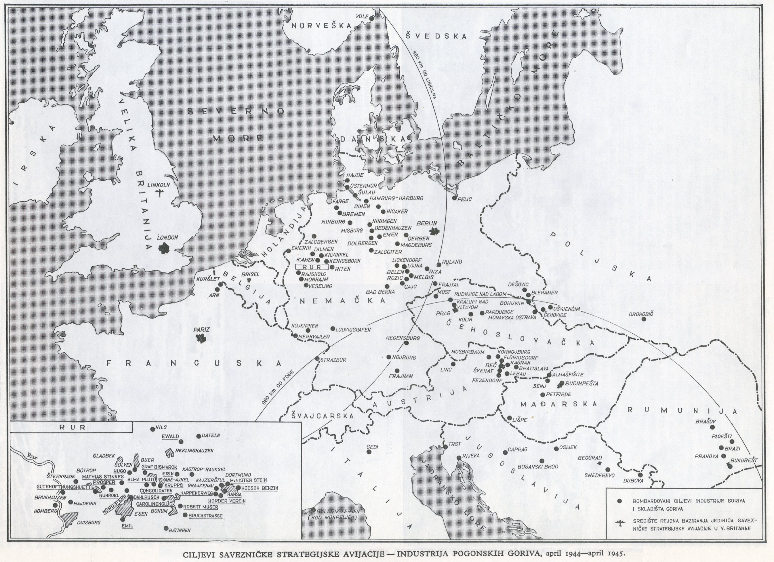 Немачке. Од септембра британска авијација прешла је на дневна, а америчка у новембру на ноћна дејства. Крајем 1944. немачка ловачка авијација показује видне знаке слабости. У 1945. саобраћај и индустрија нафте били су примарни циљеви. У фебруару савезнички напади на немачке комуникације (операција Цларион) потпуно су паралисали немачки саобраћајни систем. Истовремено са нападима на саобраћај и постројења за производњу петролеја, нападани су и неки већи градови (Берлин, Дрезден и др.) и аеродроми (крајем марта и почетком априла 1945. у току само једне седмице уништено је 1738 авиона на 59 аеродрома). Сужавањем обруча савезничких снага у Немачкој, све је мање било циљева за стратегијско бомбардовање, па су коначно завршена 26. априла.