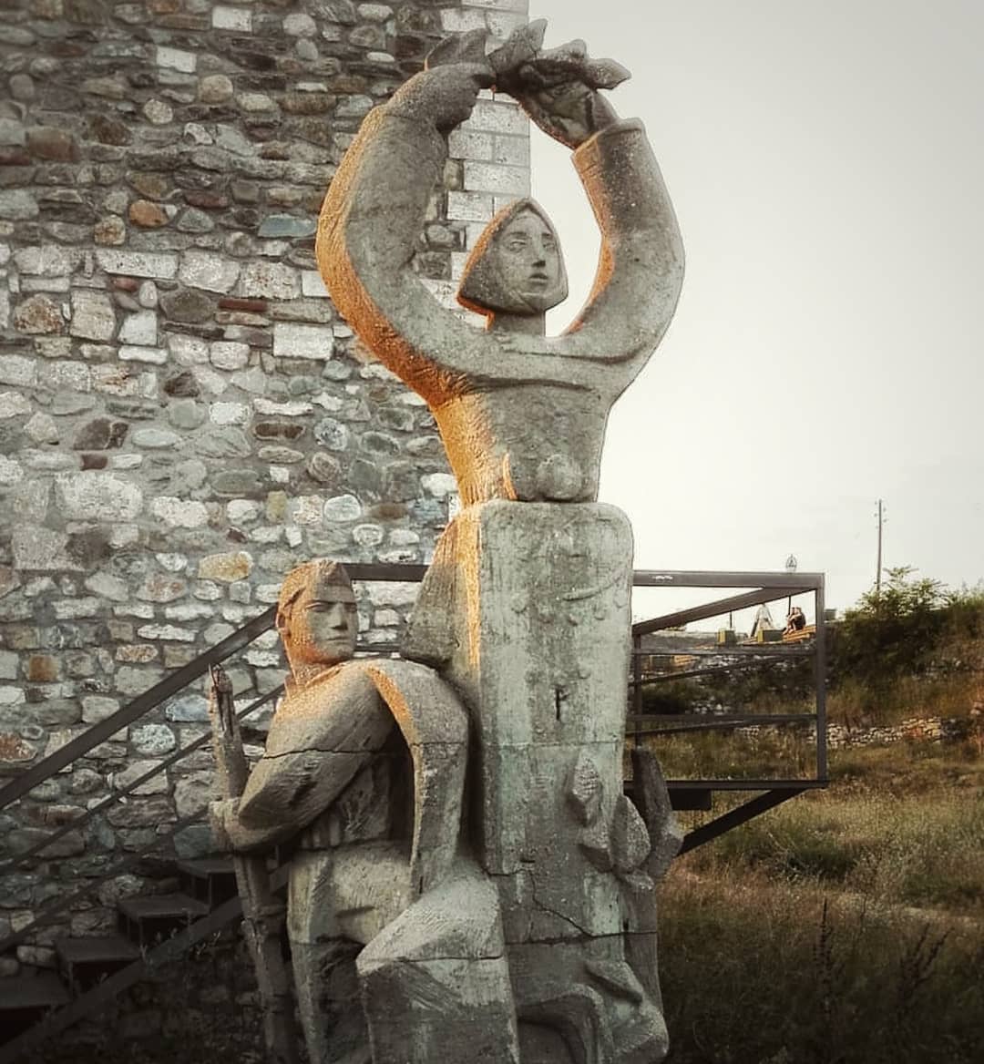 Споменик „Снага, слава и победа“, у знак сећања на борце и жртве погинуле током Народноослободилачке борбе (1941-1945). Ово дело изрезбарено на камену приказује женску фигуру како држи руке подигнуте са маслиновом гранчицом, док партизански борац седи спреман и посматра поред ње. Споменик се налази на тврђави Кале изнад града Скопља, Северна Македонија.